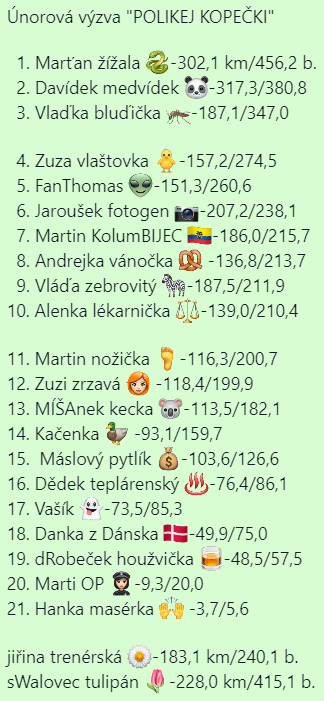 I v únoru pokračují Havířovské běhny v polikání kyláků za stejných podmínek jako v lednové výzvě. Navíc se, ale v únoru budou polikat kopečki pro posílení svalů v nohou, protože se sílou roste i rychlost s vytrvalostí. Takže kromě body za kyláky jsou v únoru i body za výškové metry, a to za každých 100 nastoupaných metrů je jeden bodík. Podmínkou je mít v tréninku nastoupáno aspoň 10 metrů na jeden kylák. Dále i platí bonus pro děvčata +50% ke každému uběhnutému kyláku, pak všem +20% bodů z polknutých týdenních kyláků pokud běhna dá čtyři a více tréninků v týdnu. Nově je i bonus +50% v bodech za kyláky polknuté v měsíci, ovšem za podmínky, že běhna byla lepší jak v lednu. Tak polykejte běhny jedny nehodné, Havířovské :* Váš fanfantulipán !